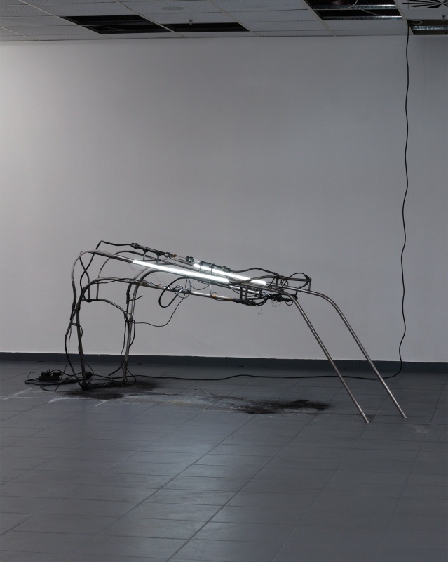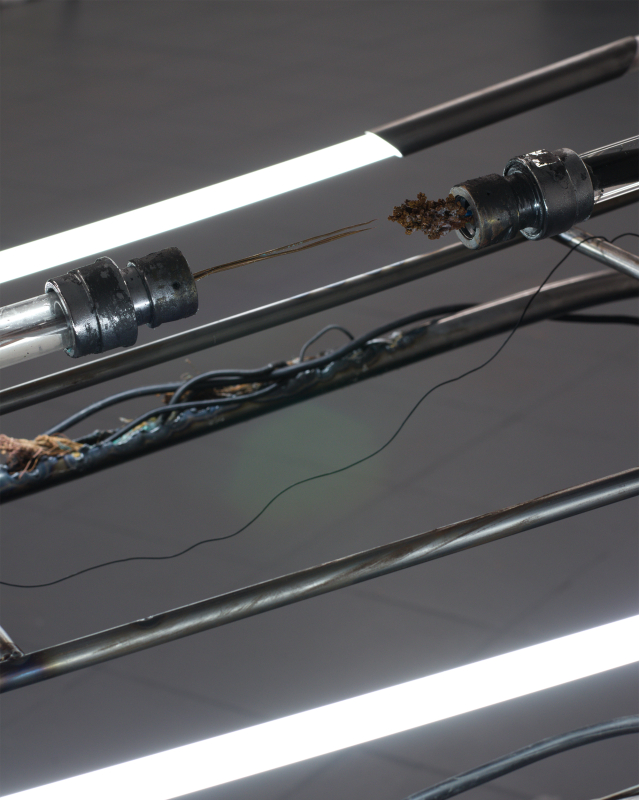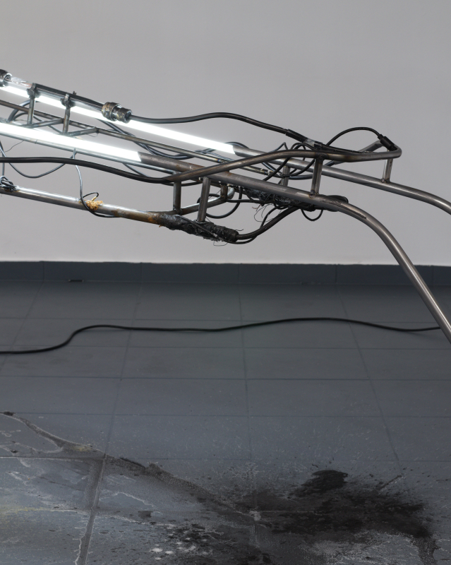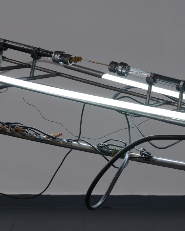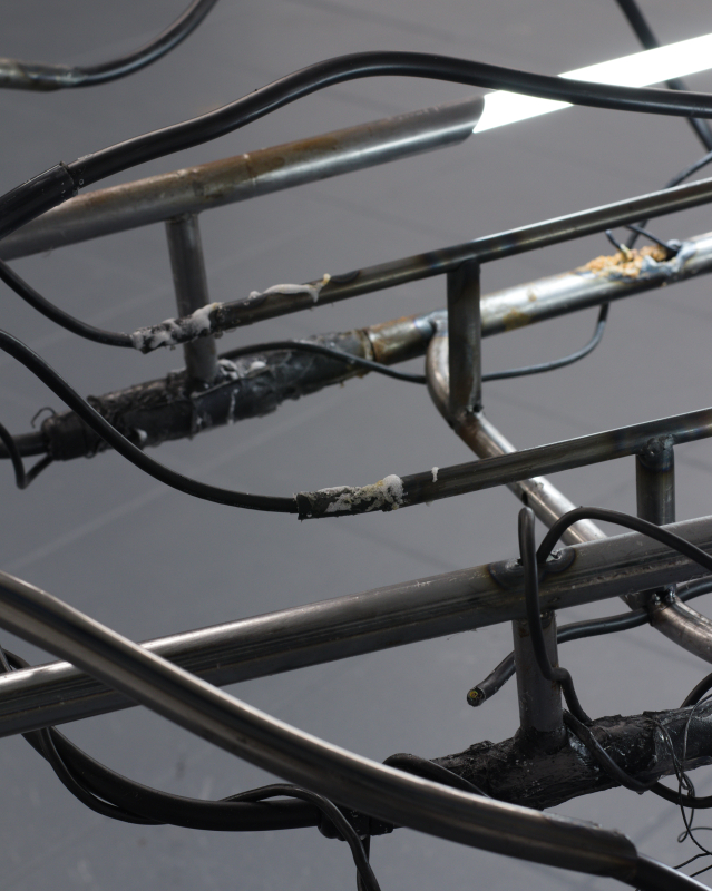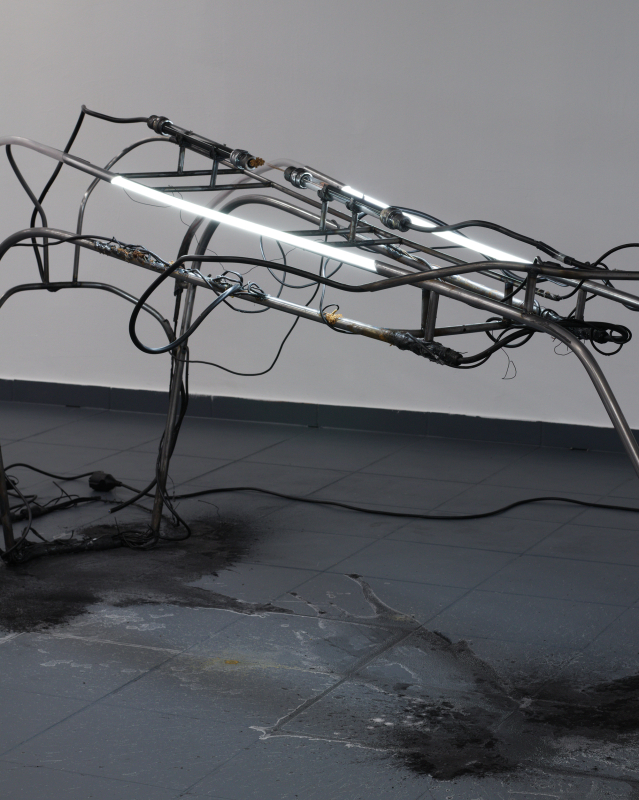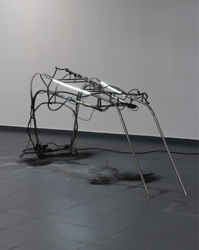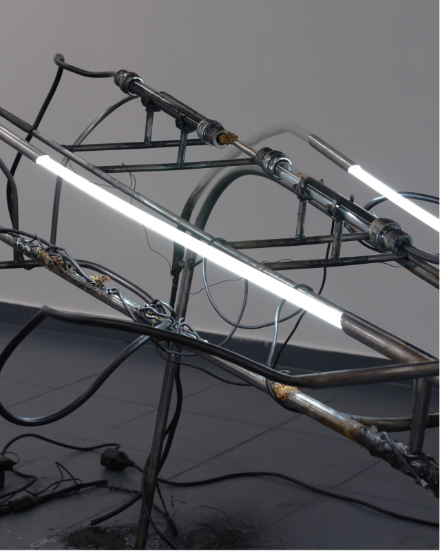 The work proposes an image of restitution: corrosion emphasizes entropy, the intrinsic movement of materials toward disorder and disintegration — while crystallization reveals the inherent structuring tendencies of matter itself. As the system self-consumes, energy is not dissipated but converted, illuminating the slow regression of engineered material to its elemental state.